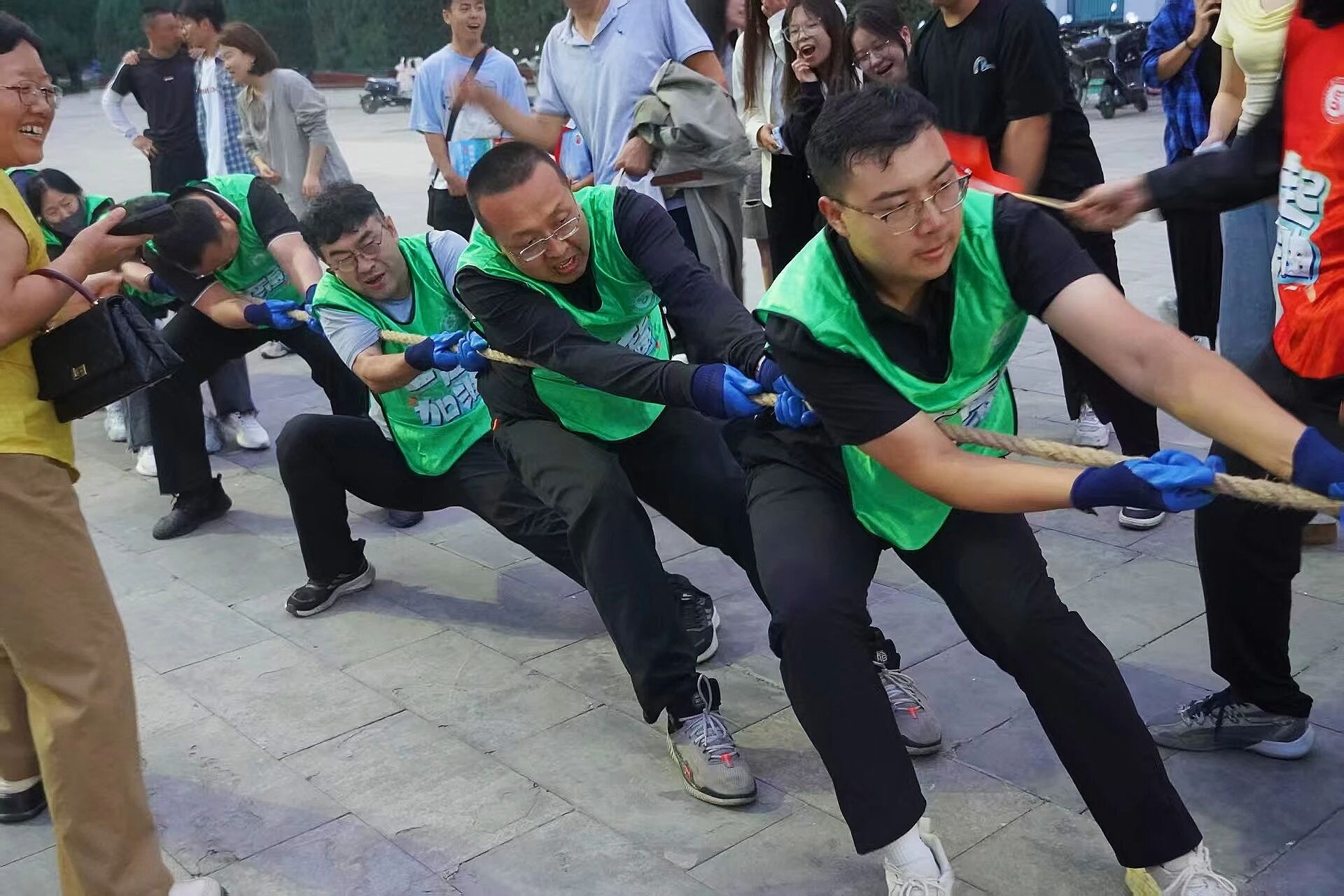 比赛开始前,我系参赛教师早已做好准备,大家围在一起交流战术、调整状态,从站位排列到发力节奏,每一个细节都反复确认,尽显严谨态度。随着裁判哨声响起,老师们迅速进入状态,紧握长绳、身体后倾,目光坚定地向着同一方向发力。