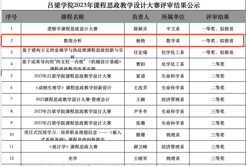 此次大赛根据《山西省教育厅关于举办2023年山西省普通高等学校课程思政教学设计大赛暨第四届全国高校教师教学创新大赛山西赛区课程思政组别比赛的通知》和tyc7111太阳集团《关于举办2023年tyc7111太阳集团课程思政教学设计大赛的通知》文件精神要求,通过个人申报、系推荐、教务处组织专家评审等环节最终评出各类奖项。本次大赛共分为两个环节,一是课堂实录,以课堂教学设计现场展示的方式体现课程思政润物无声地融入教学环节;二是课程思政创新报告,报告系统汇报了《数值分析》课程思政教学设计模式、具体做法以及取得的成果。