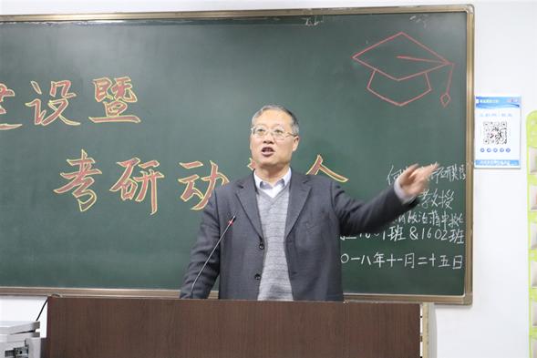 刘方主任在讲话中,对此次主题班会的召开给予了高度评价。他如数家珍,带领大家重温了数学系办学多年积淀形成的优良系训、系风、教风和学风,并信手拈来向同学逐字逐词解读了“实事求是、精益求精、生动活泼、开拓创新”的优良学风,并对同学们提出三点殷切期望:一是要有理想信念,有抱负志向,有想法,不能碌碌无为,荒废青春和学业。二是要有毅力,发扬吃苦精神,并以一首叶剑英诗词《攻关》“攻城不怕坚,攻书莫畏难。科学有险阻,苦战能过关。”勉励同学要奋发有为,不达目标不罢休!三是有方法,数学是一切自然科学的基础,科学方法论的核心是数学思维和数学方法,希望同学们夯实专业基础,提高逻辑思维能力,严谨治学,做一个大写的数学人。刘主任强调指出,优良的学风是考研的重要前提和基础。关于考研,同学们要特别注意四点:一是好氛围、好环境很重要。他引用《孔子家语·六本》中“故曰与善人居,如入芝兰之室,久而不闻其香,即与之化矣。与不善人居,如入鲍鱼之肆,久而不闻其臭,亦与之化矣。”教导同学要以宿舍、学习小组等形式,互相激励、互相督促,形成你追我赶、积极向上的团队氛围。二是好习惯很重要,他列举了诸如自律、时间管理、情绪管理等方面的例子,强调良好学习习惯、生活习惯的养成,受益终生。三是学习方法很重要,要吸收借鉴好的适合自己的学习方法、技巧,提高自身的学习能力和学习效率。四是自信心很重要,要坚信我能行,自信是成功的基础,是持续坚持的不竭动力。
