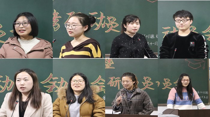 学生代表分别发表考研宣言。聂晓惠同学分别对英语、数学、政治等必考科目做出详细的考研计划方案,并为自己代言。朱鹤同学,期待明天的阳光,吸取营养。王佳同学从为何考研、目标、效率、坚持做出讲解,坚信没有什么不可能!徐佳泽同学决心考研,圆高考未完成的梦。