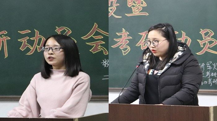 各个考研宿舍代表也分别发表考研宣言。文华苑1#207宿舍代表周雪:貌似我们在随波逐流,别人做什么自己也在做什么,除了考研不知做什么,向宿舍其他人学习。301宿舍代表张扬介绍宿舍成员及学习情况,在考研这件事上,她们没有事先商议,但她们最终目标是一致的。303宿舍代表王亚蓉:考研不是口号,是实际行动,不求尽如人意,但求无愧于心。304宿舍代表刘颖:考研首先是长见识,其次是长知识,努力拼搏,在平凡中创造不平凡。305宿舍代表任婷:没有什么可以雪中送炭,这个世界上只有锦上添花,你想要添花,首先你先变成锦。308宿舍代表徐少霞:不要给自己留后路,考研就是两个字:坚持”。323宿舍代表赵:考研考的不仅是知识,还是一种毅力。324代表韩萍:坚持自己选择的路,成为自己期盼的人。成国栋老师还为他们分别授牌“考研宿舍”,以激发同学学习动力,营造考研氛围。
