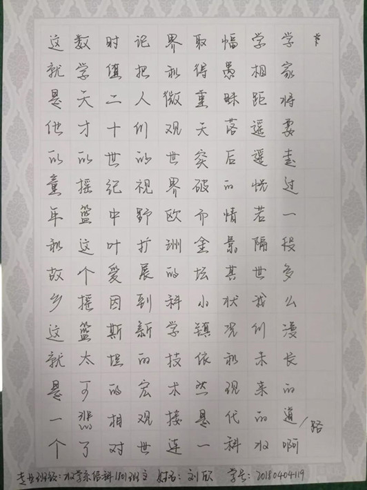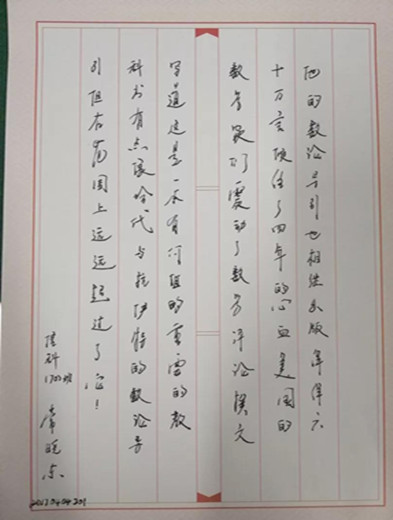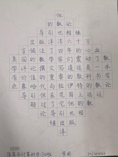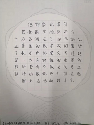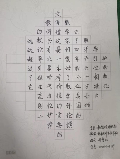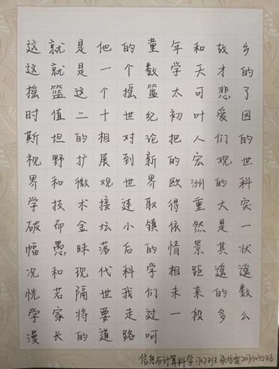 12月,数学系旨在培养学生综合素质的“五个一工程”重启,分团委学生会率先举办了钢笔字比赛。比赛分为初赛和决赛两个环节,书写作品为叙述数学家华罗庚的报告文学《高山与平原》节选段落。最终选出1等奖6名,2等奖12名,3等奖19名。