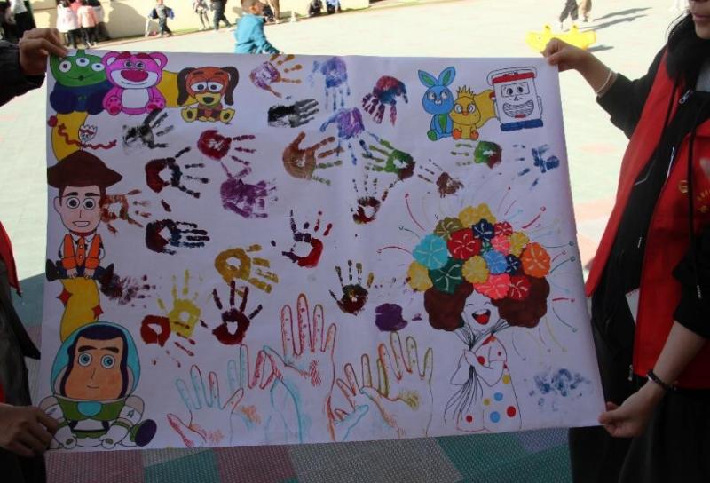 之后在幼儿园老师与志愿者们的合作下,孩子们与志愿者们其乐融融,一起动手在画有卡通人物的展报上留下属于自己的一份彩色手印痕迹,完成了一幅独一无二的手印画。