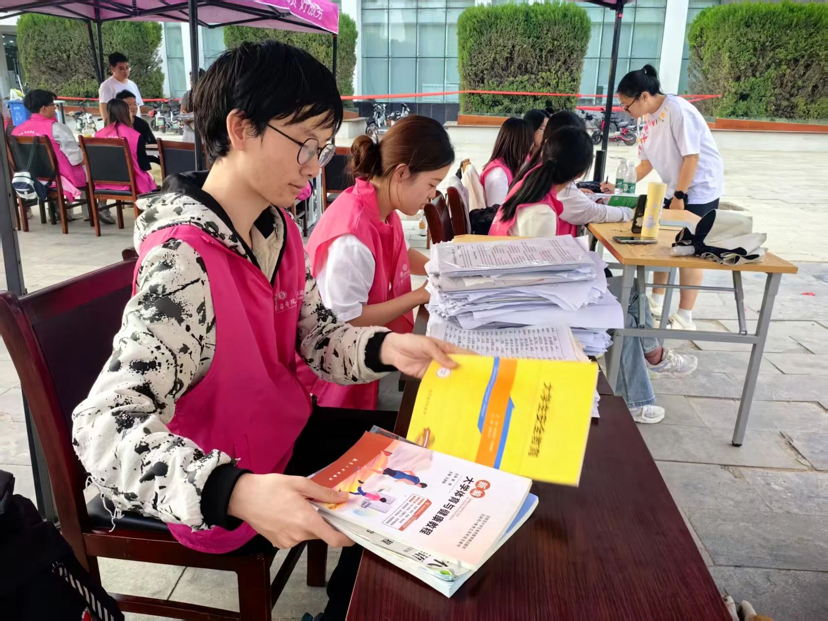 现场,工作人员分工明确、有条不紊。在书籍捐赠区,同学们有序排队登记捐赠信息;在分类整理区,志愿者们仔细甄别每一本书籍,按照人文类、经济类、工学类等类别,将它们整齐摆放,为后续的高效利用做好准备。同时,负责人组织参与人员进行纸质版签到,确保活动各个环节紧密衔接、有序推进。