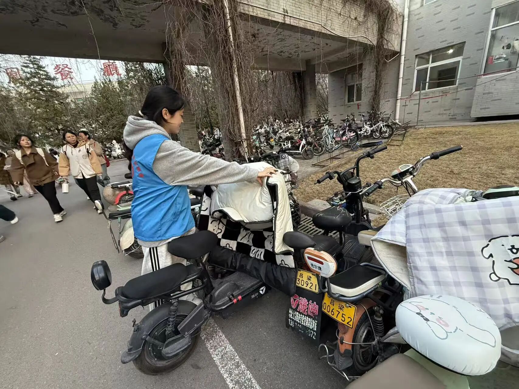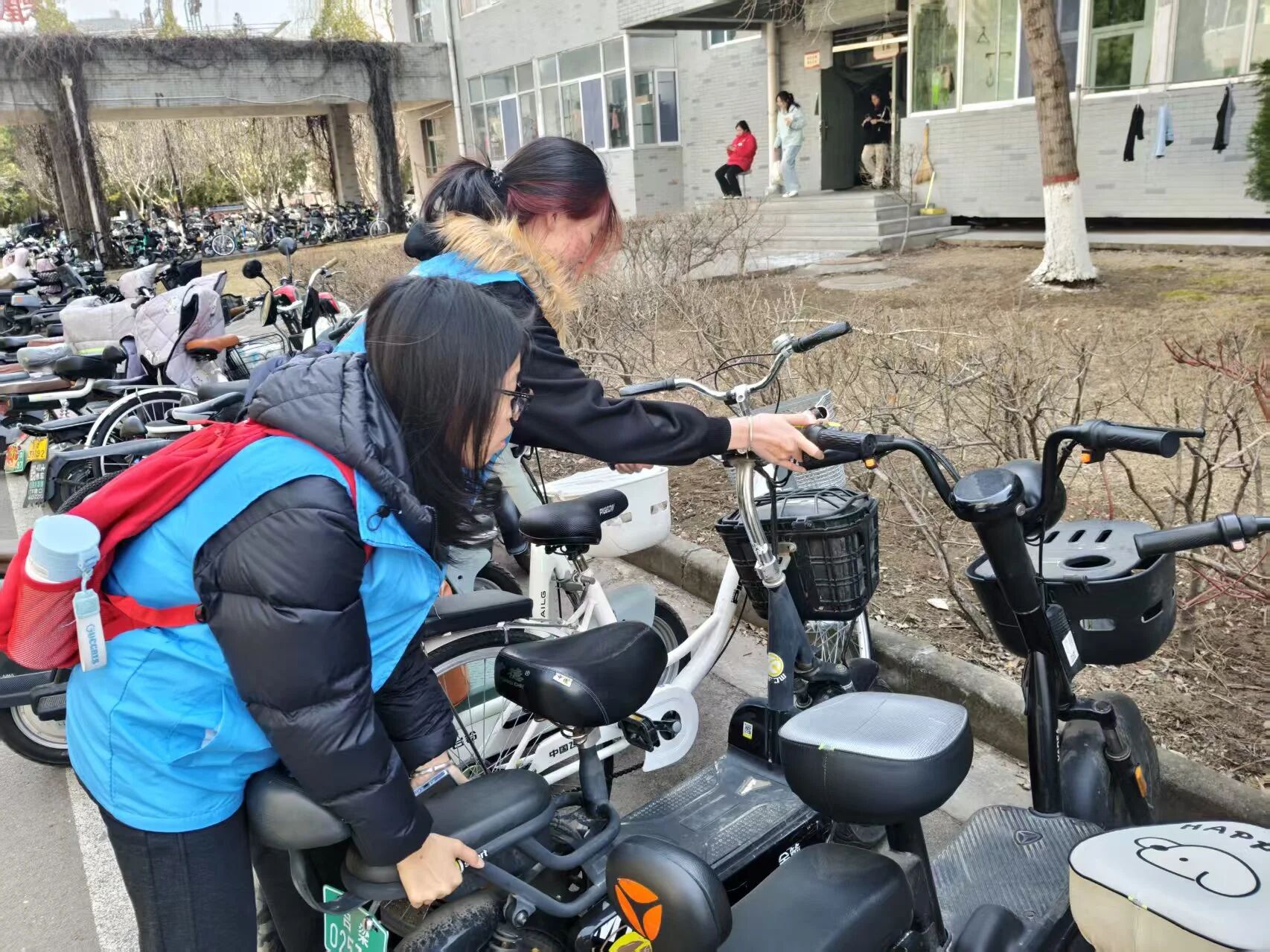 就餐时段校园人流、车流密集,部分区域易出现车辆乱停乱放、堵塞通道等现象。志愿者们准时到岗、分工协作,身穿志愿马甲,在食堂周边、主干道及停车集中区域开展劝导服务。大家耐心引导师生将电动车、自行车有序停放在指定区域,及时扶正歪斜车辆、规整乱停车辆,主动提醒过往同学遵守校园交通规则,文明停放、安全出行。