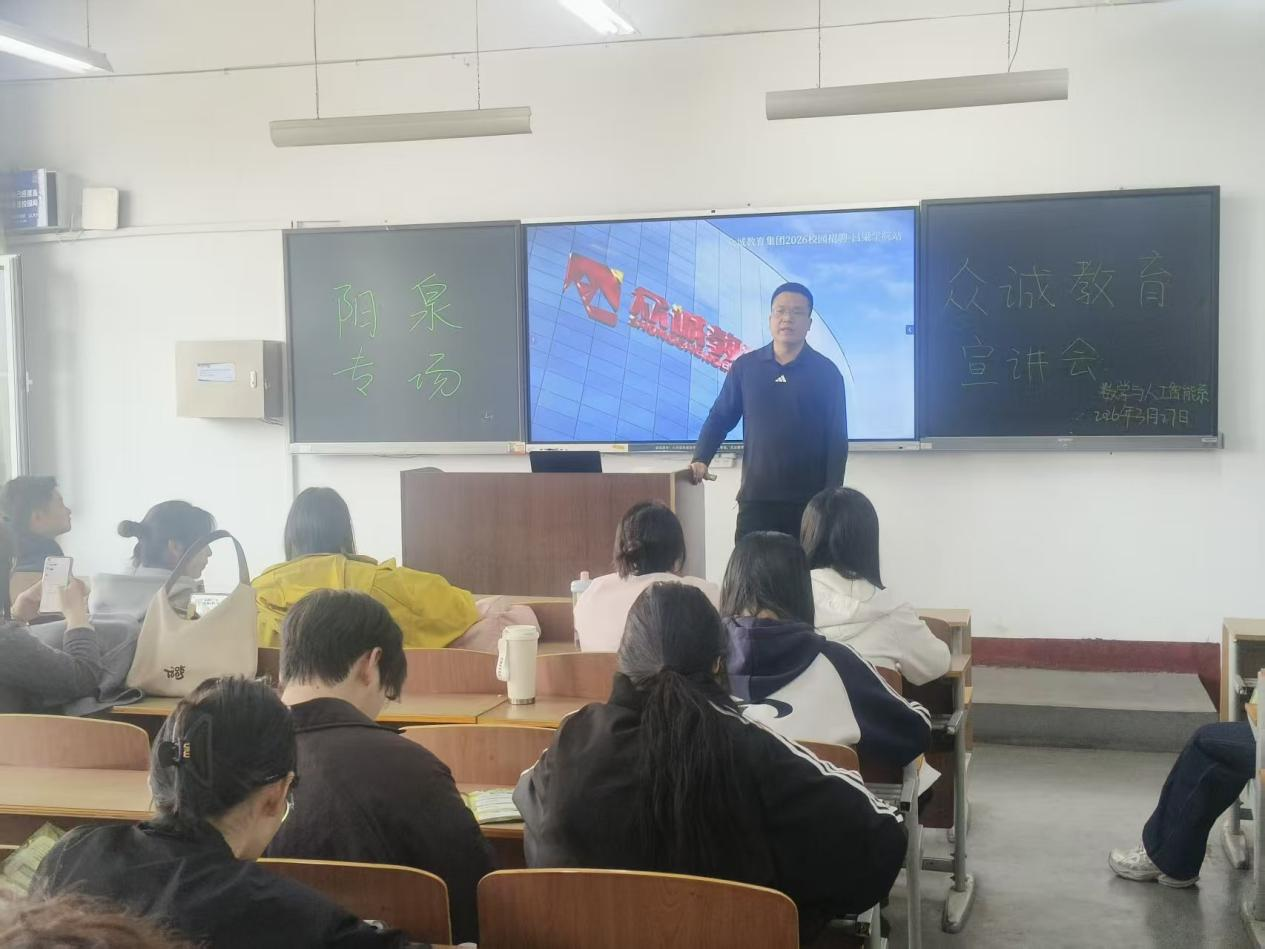 为精准引育高素质教育人才,助力高校学子明晰职业方向,搭建校企合作双向桥梁,近日,众诚教育阳泉专场校园招聘宣讲会在tyc7111太阳集团顺利举办。本次活动聚焦教育类相关专业学子,以“聚才育新,诚赴未来”为主题,通过公司介绍、人才需求解读、成长计划分享、求职指导等多元环节,现场氛围热烈而真诚。