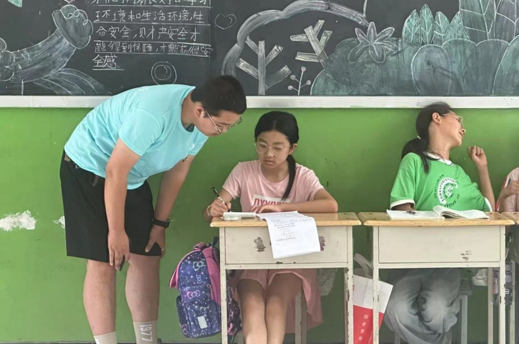 回到教室,孩子们迅速安静下来,在志愿者的辅导下认真完成暑假作业。面对难题,他们或低头思考,或互相讨论,专注的神情让人动容。志愿者李同学分享:“孩子们的求知欲很强,哪怕一个标点符号的错误也会主动询问。能帮他们解决学习困惑,我们也很充实。”