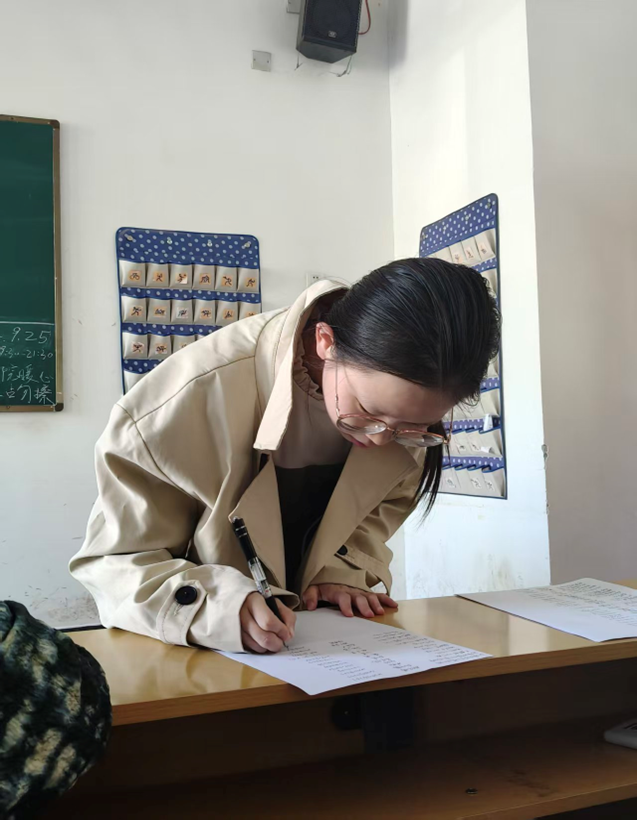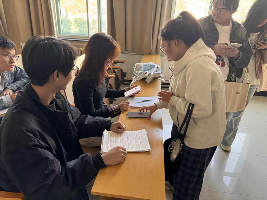 活动自9月20日开启报名通道后,便迅速点燃了全校学子的参与热情。比赛当日,综A-114教室内暖意融融:有的同学埋首于方格稿纸间,笔尖在纸页上游走,将对壶口瀑布奔涌气势的震撼、平遥古城文化底蕴的思索,化作一行行饱含温度的文字;有的同学围聚在志愿队成员身旁,在工作人员的耐心引导下扫码签到、确认参赛信息,现场既有创作的专注沉静,亦有交流的热烈温馨。从祖国壮丽山河的自然咏叹,到历史文化的深度溯源,从科技发展的自豪抒怀(如航天探月、高铁纵横等时代印记),到身边爱国事迹的细腻描摹,同学们的作品体裁不拘一格——记叙文以故事承载深情,散文以笔墨勾勒山河,诗歌以韵律迸发激情,议论文以思辨剖析家国发展,每一篇都凝聚着青年对祖国最真挚的眷恋。