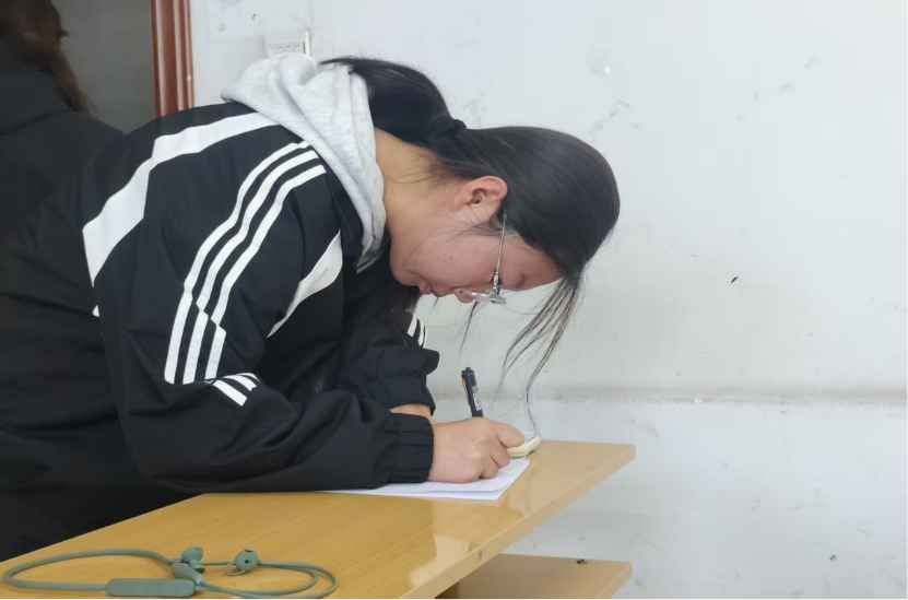 活动当日,综A-114教室的签到场景格外动人:照片中,穿黑白条纹外套的同学将身体深深俯在桌沿,眼镜滑至鼻尖仍专注地在签到表上落字,手中的笔仿佛盛满对留守儿童的千言万语。
