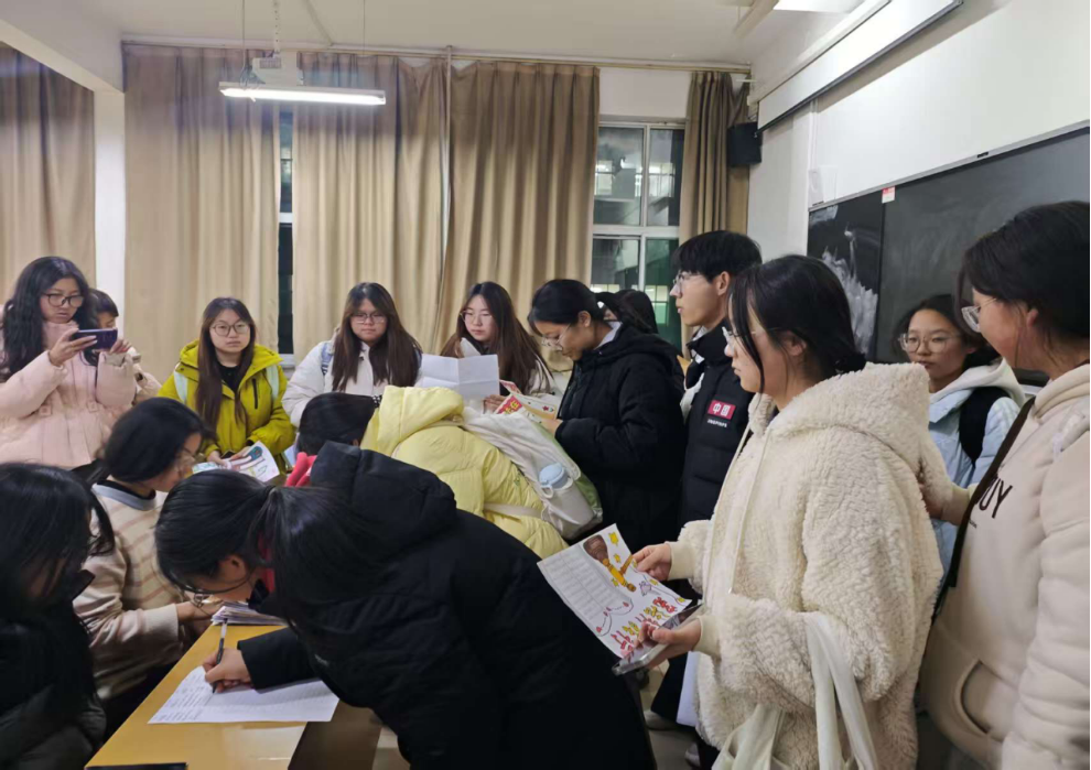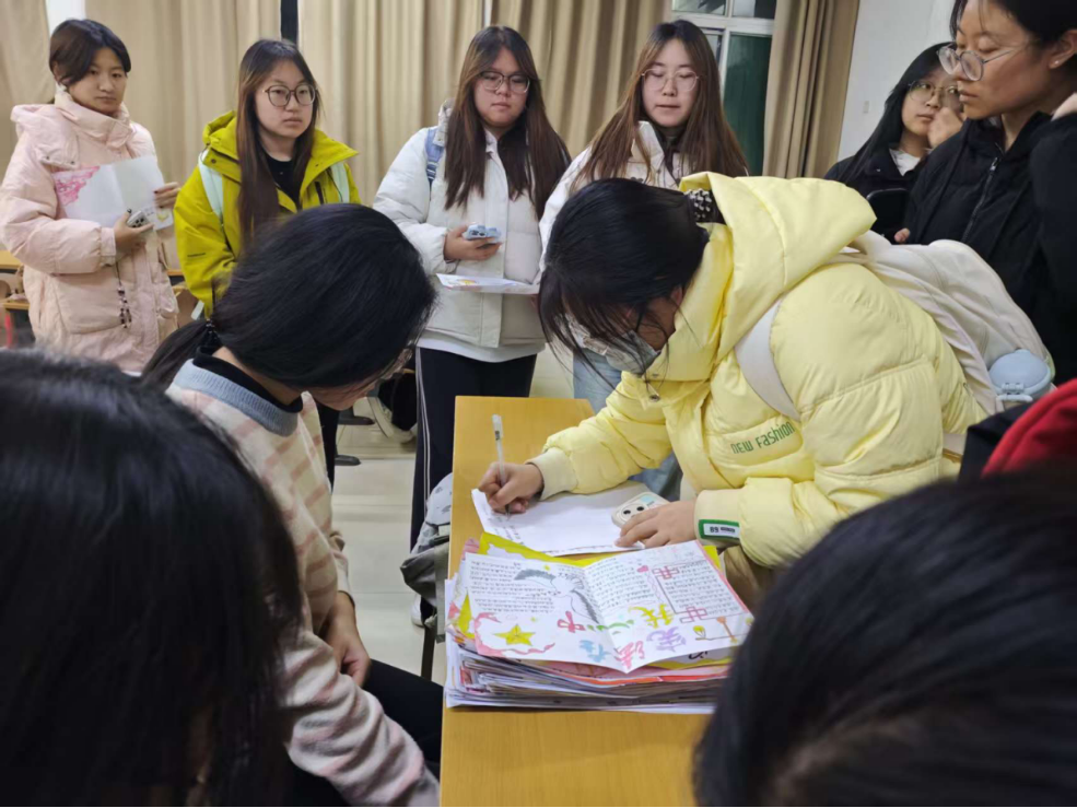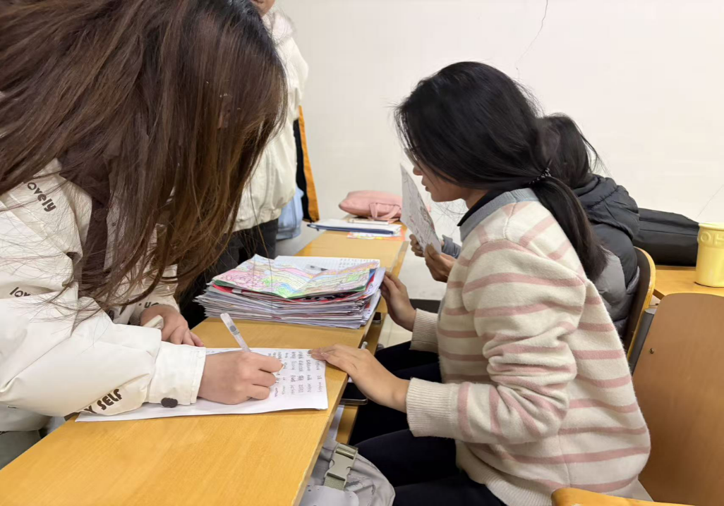 活动筹备阶段,志愿队通过线上征集等方式动员,明确以“宪法核心内容+青春法治实践”为创作方向。活动当天,教室内暖意融融:志愿者们围坐在桌前,一边整理堆叠的手抄报作品,一边细致记录评分;参与同学手持作品交流创作思路,不少作品以漫画诠释宪法条文、用色彩搭配突出“权利与义务”主题,既具知识性又富创意。
