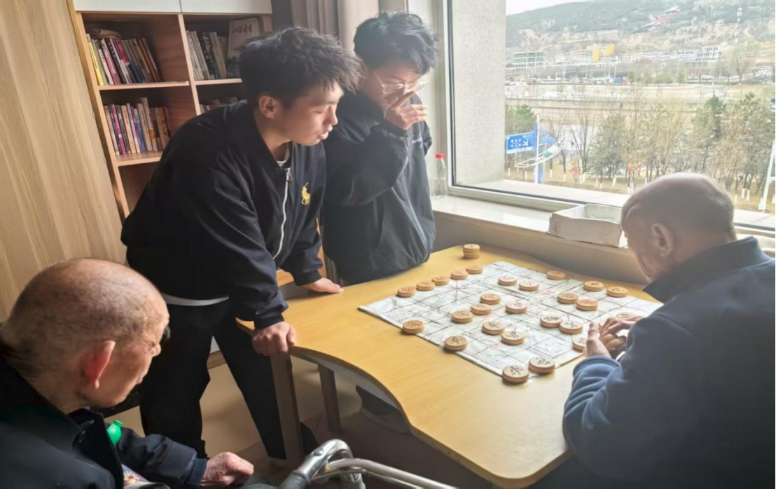 活动当天,志愿者们带着真诚与热情来到养老院,在工作人员的引导下迅速投入服务。大家主动围坐在老人身边,亲切地与他们唠家常、话往昔。志愿者们耐心倾听老人们讲述年轻时的奋斗故事、生活趣事,细致询问老人的身体状况、日常起居和兴趣爱好,时而轻声安慰,时而开怀畅谈。在轻松温馨的交流中,老人们紧锁的眉头渐渐舒展,孤独感被驱散,欢声笑语回荡在庭院之中。志愿者们与老人对弈象棋,落子从容、笑语连连,在切磋棋艺中拉近彼此距离;休息区里,大家围坐在老人身旁,耐心倾听他们讲述过往经历,关切询问饮食起居与身体健康状况,用真诚的交流驱散孤寂,让温情在话语间流淌。