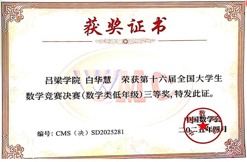 全国大学生数学竞赛由中国数学会主办,自2009年创办以来已成为全国高校规模最大的基础性学科竞赛之一。本届竞赛覆盖32个赛区,吸引了包括北京大学、清华大学等1223所高校逾32.5万名学生参与全国预赛,最终仅千余人晋级决赛。在山西赛区数学B类预赛中,白华慧以全省第二名的成绩脱颖而出进入决赛(山西赛区B类决赛名额仅3人),展现了我校学子的扎实功底。