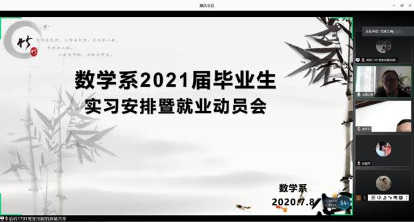 7月8日上午,数学系召开2021届毕业生实习安排暨就业动员线上会议。系领导班子、辅导员班主任、全体2017级学生导师、全体2021届毕业生、数学系校企合作单位代表共245人参加了会议。