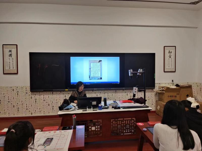 张老师首先向同学们做了书法基础知识普及。她从章法讲起,带着同学们从大篆小篆到隶书再到楷书行书草书历代名帖一路欣赏下来,同学们从中领略到了一幅作品的布局、品格、笔画、结构以及落款等等要素所表达出的美妙含义。