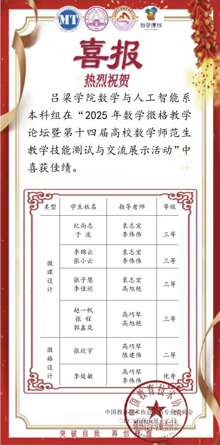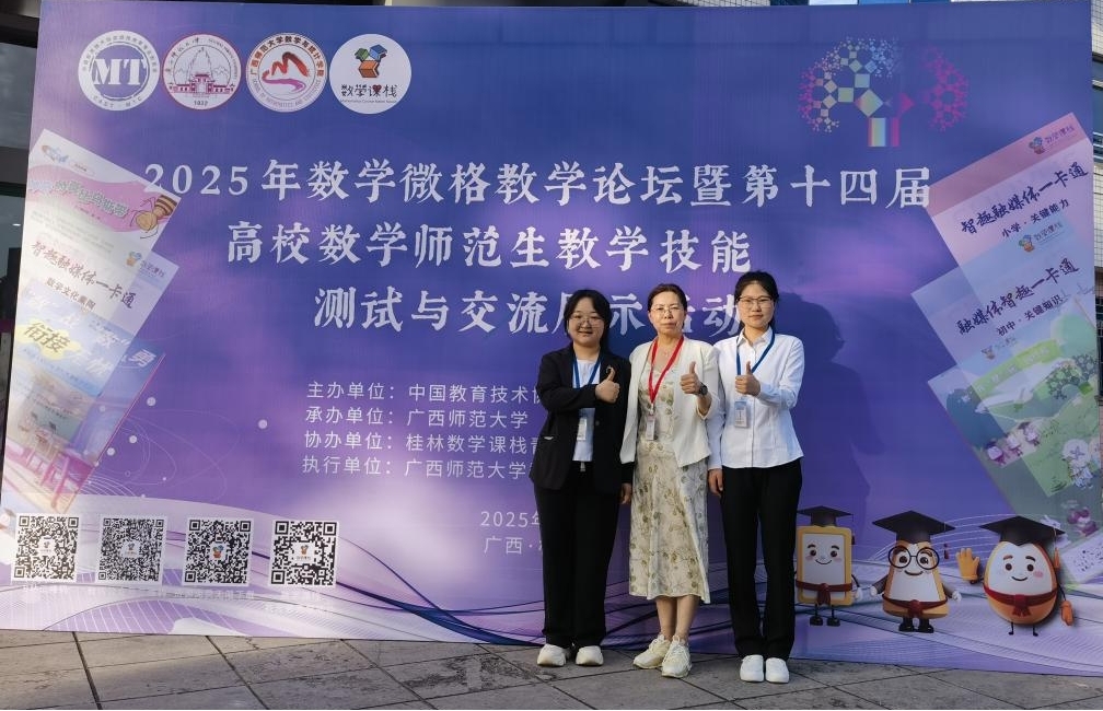 5月9至12日,2025年数学微格教学论坛暨第十四届高校数学师范生教学技能测试与交流展示活动在广西师范大学举行,来自全国90余所高校的1700余名本科生参加本次比赛。经过激烈的竞争,我系数学与应用数学专业学子首次参加比赛取得二等奖1项,三等奖4项,优秀奖1项的优异成绩。值得一提的是我系师生在此次大赛中巧妙地将AI融入教学中,为此后教学提供了一个新范本。