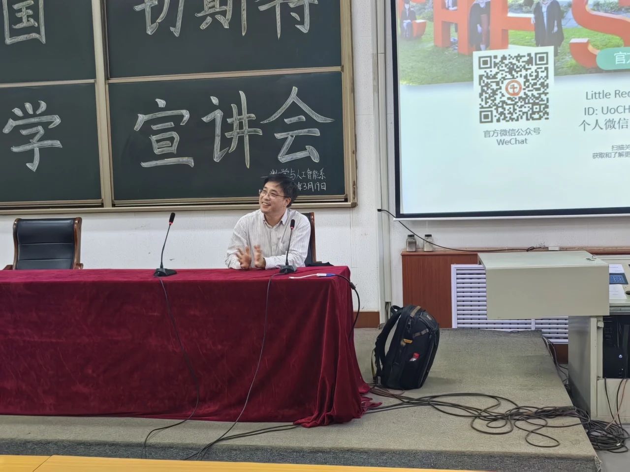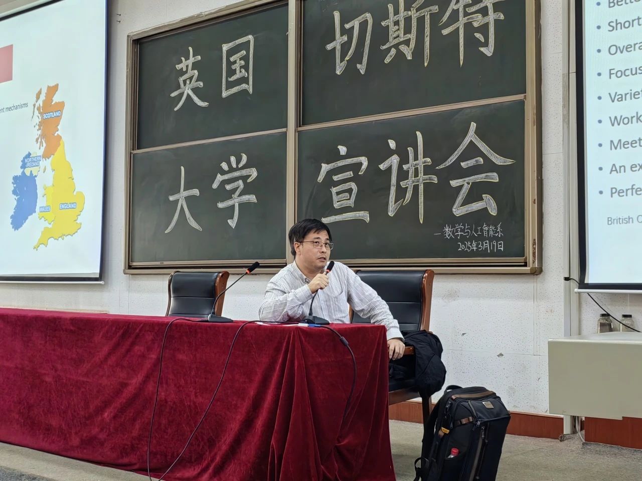 宣讲会开始,徐进老师发表了热情洋溢的开场致辞。他简要介绍了切斯特大学的历史、办学理念以及国际化特色,并强调了该校对国际学生的重视与支持。徐进老师的致辞为整个活动奠定了开放、包容的基调,激发了同学们对英国高等教育的浓厚兴趣。