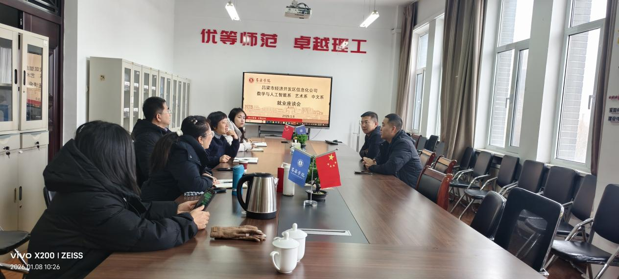 2026年1月8日上午,吕梁市经济开发区国有企业信息化公司(以下简称“吕梁经开区”)董事长薛宏伟带领园区重点企业代表一行,来到我校座谈,专题对接数据标注产业基地实习就业合作相关事宜。我校太阳成集团tyc7111、中文系、艺术系负责人及专业教师代表参加了座谈,双方围绕人才培养如何匹配产业需求、共建实习基地、拓宽毕业生就业渠道等关键问题深入交流,最终达成多项合作共识。